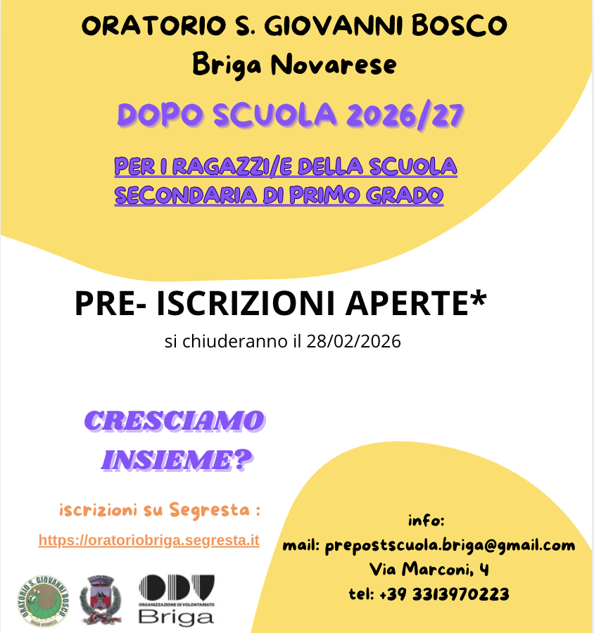 Il servizio di pre e post scuola promosso dall’Oratorio “San Giovanni Bosco- Circolo ANSPI” di Briga Novarese, in collaborazione con il Comune di Briga Novarese e O.d.V. (Organizzazione di Volontariato) di Briga Novarese, è rivolto ai bambini associati all’omonima Associazione di Promozione Sociale, in regola con il versamento della quota associativa per l’anno sociale 2025/2026 e che frequentano, nell’anno scolastico 2025/2026, le sezioni della scuola d’infanzia, le classi prima, seconda, terza, quarta e quinta primaria, nonché prima, seconda e terza secondaria*.
